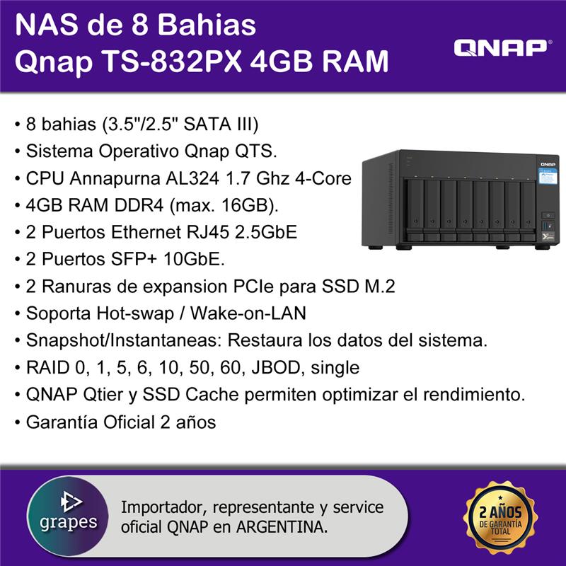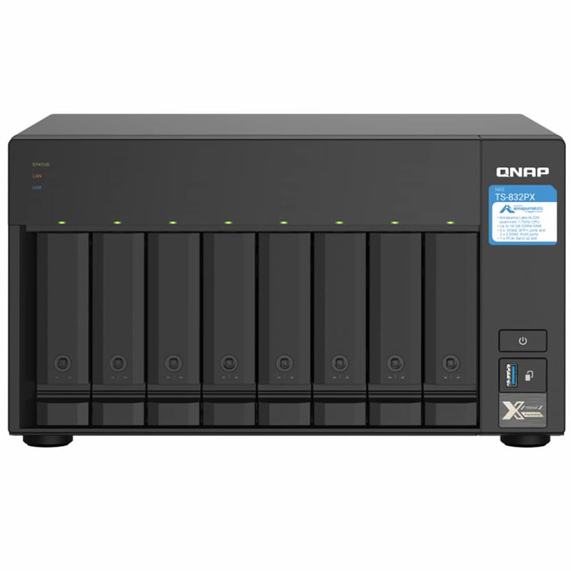 El TS-832PX de cuatro núcleos a 1,7 GHz incluye ocho bahías de unidades SATA de 3,5" a 6GB/s, lo que ofrece enormes capacidades de almacenamiento para una amplia gama de aplicaciones y el uso diario. Con dos SFP+ 10GbE y dos puertos LAN 2,5GbE, el TS-832PX admite redes de próxima generación para permitir el uso de aplicaciones que requieren un alto ancho de banda y ofrecer un acceso y un uso compartido de archivos más fluido. También son compatibles diversas tarjetas PCIe, incluyendo tarjetas QM2 que ofrecen caché SSD M.2 SATA/NVMe y almacenamiento con organización automática por niveles Qtier™ para mejorar el rendimiento del NAS.